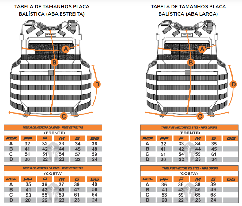 Internamente, comporta placas balísticas rígidas e/ou flexíveis nos tamanhos padrão. Ajuste lateral e nos ombros em fita reforçada e elástico, garantindo estabilidade mesmo em deslocamentos intensos.